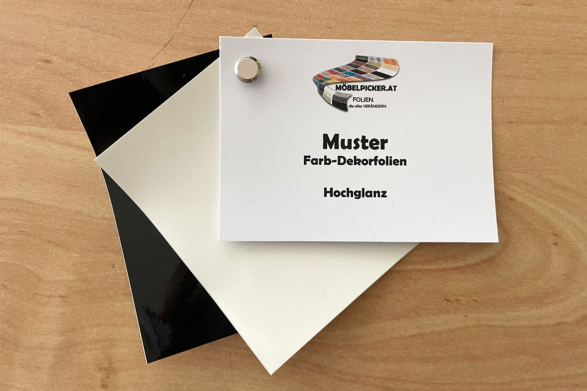 Verschaffen Sie sich einen Überblick über unsere Möbelfolien einfärbigen Hochglanzfolien auf einem Blick. In diesem Musterfächer sind Hochglanzfolien in weiß und schwarz (Größe ca. 10 x 7,5 cm) enthalten, das sind derzeit 2 verschiedene Dekore!
